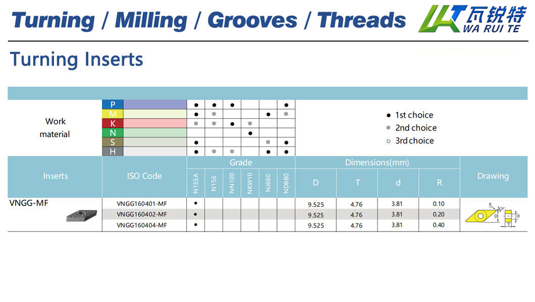 | VNGG160404-MF | N155A | D: 9.525 / T: 4.76 / d: 3.81 / R: 0.40 |