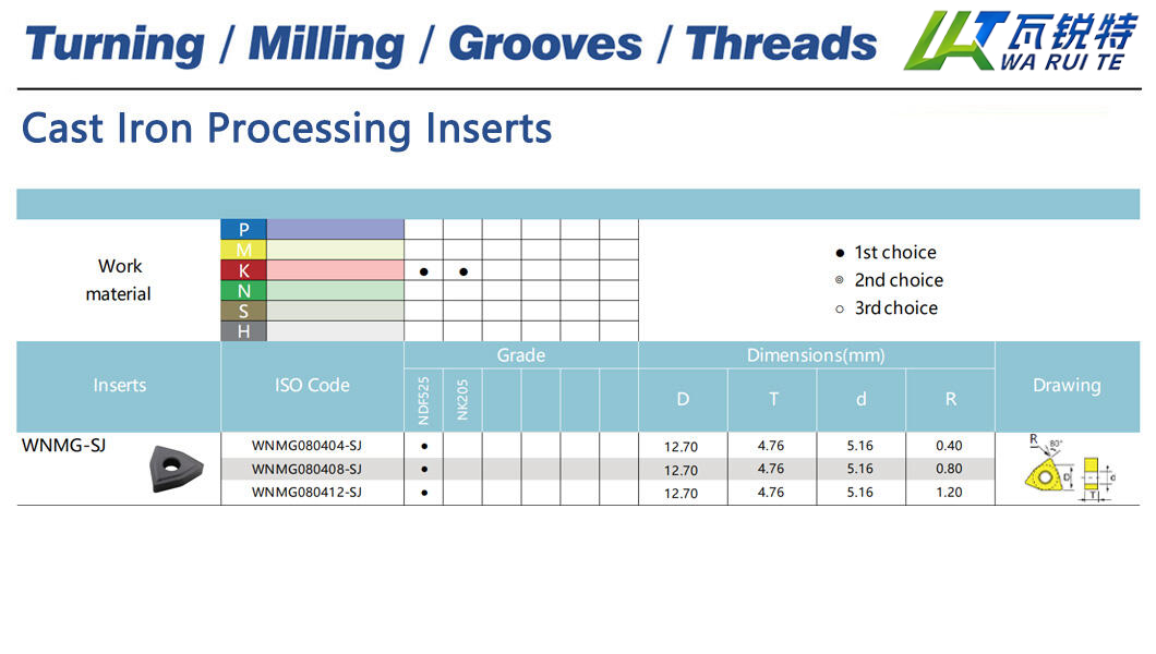 | WNMG080408-SJ | NDF525 | D: 12.70 / T: 4.76 / d: 5.16 / R: 0.80 |