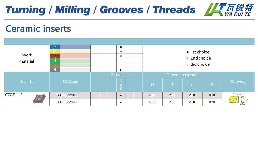| CCGT060201L-F | DNW100 | D: 6.35 / T: 2.38 / d: 2.80 / R: 0.10 |