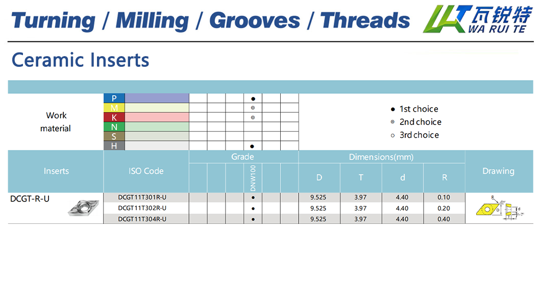 | DCGT11T304R-U | DNW100 | D: 9.525 / T: 3.97 / d: 4.40 / R: 0.40 |