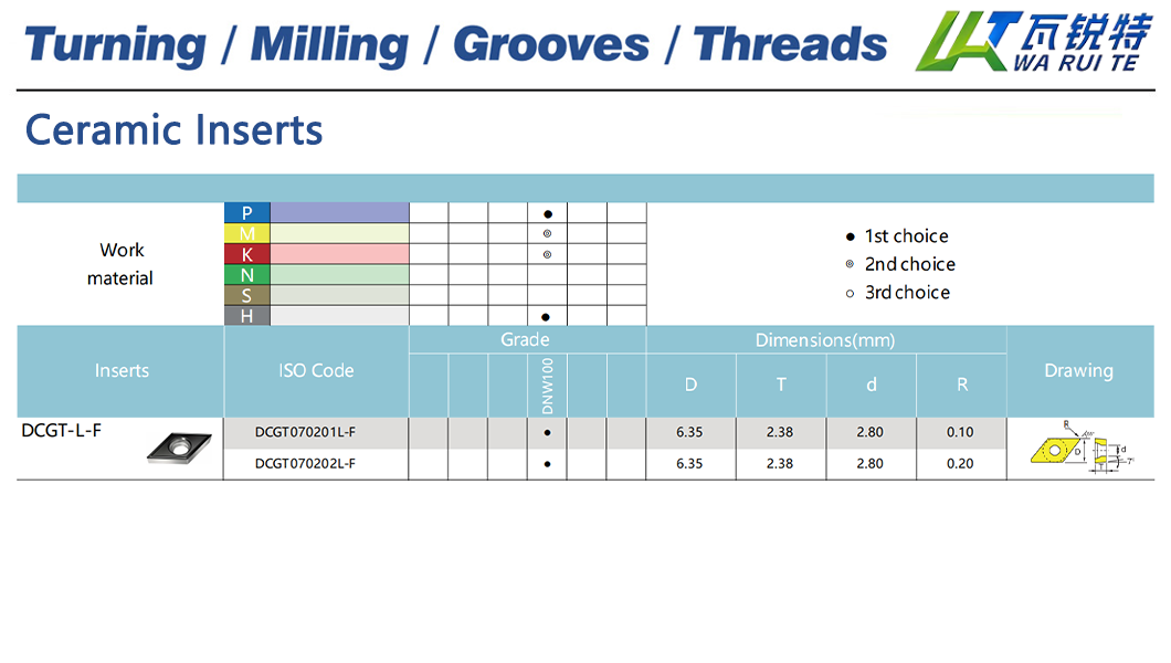 | DCGT070201L-F | DNW100 | D: 6.35 / T: 2.38 / d: 2.80 / R: 0.10 |