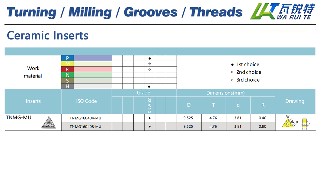 | TNMG160408-MU | DNW100 | D: 9.525 / T: 4.76 / d: 3.81 / R: 0.80 |
