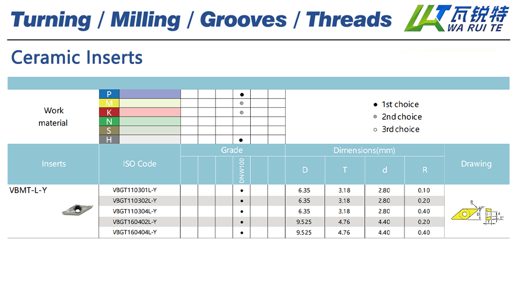 | VBGT110301L-Y | DNW100 | D: 6.35 / T: 3.18 / d: 2.80 / R: 0.10 |