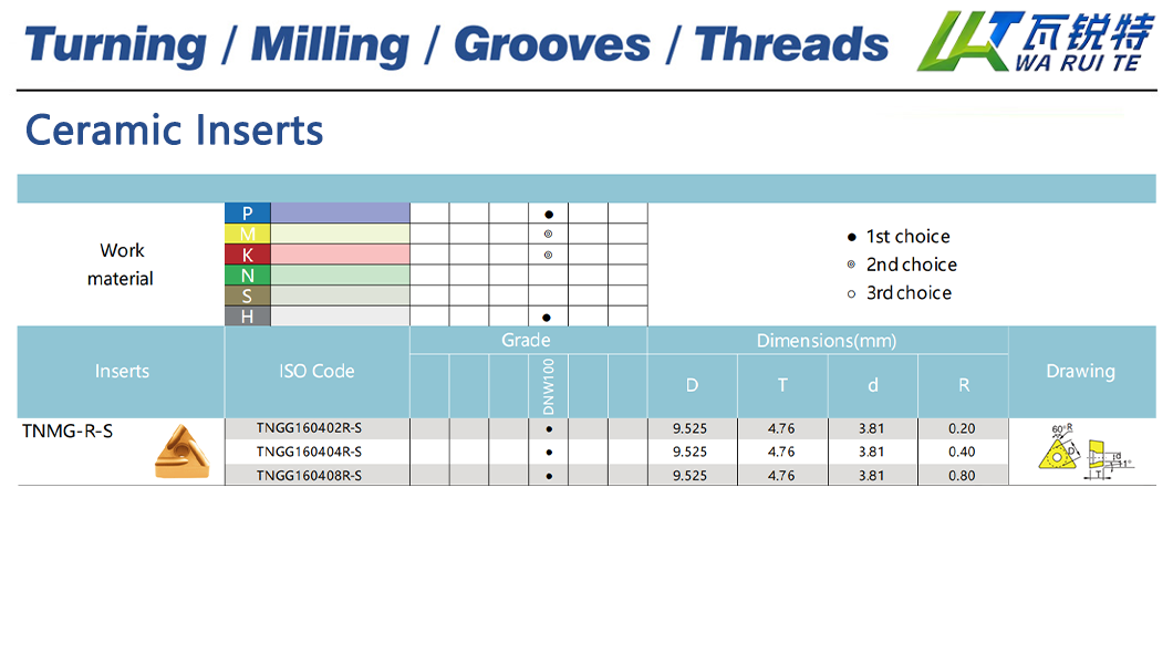 | TNGG160408R-S | DNW100 | D: 9.525 / T: 4.76 / d: 3.81 / R: 0.80 |