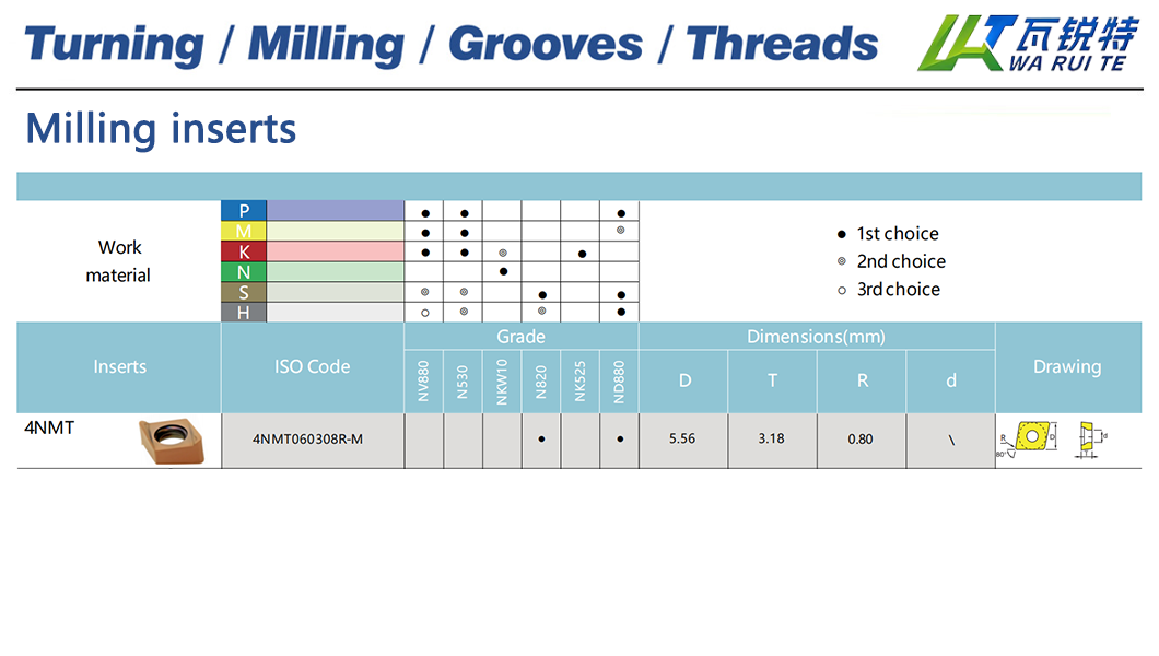 | 4NMT060308R-M | N820 / ND880 | D: 5.56 / T: 3.18 / R: 0.80 |