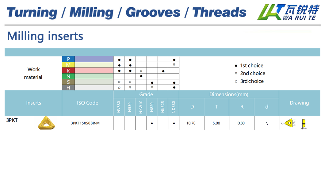 | 3PKT150508R-M | N820 / ND880 | D: 10.70 / T: 5.00 / R: 0.80 |
