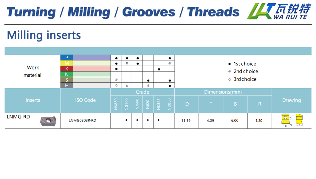 | LNMG0303R-RD | NG100 / NJ660 / N820 / NK525 | D: 11.59 / T: 4.29 / B: 6.00 / R: 1.20 |