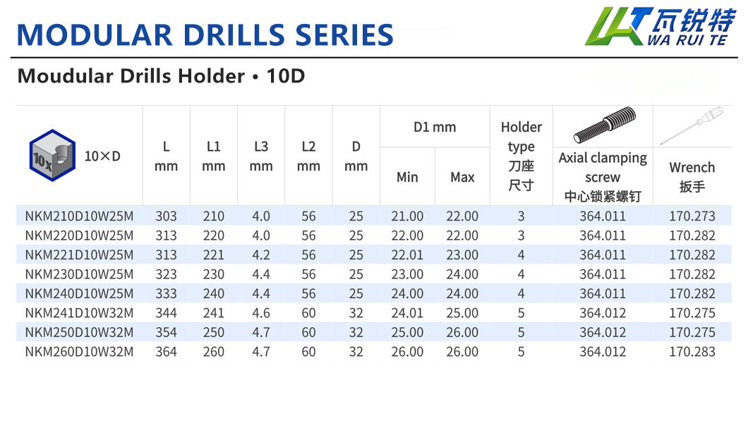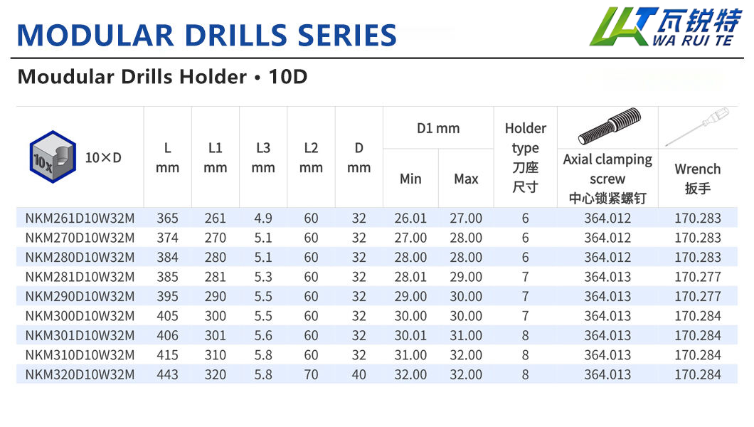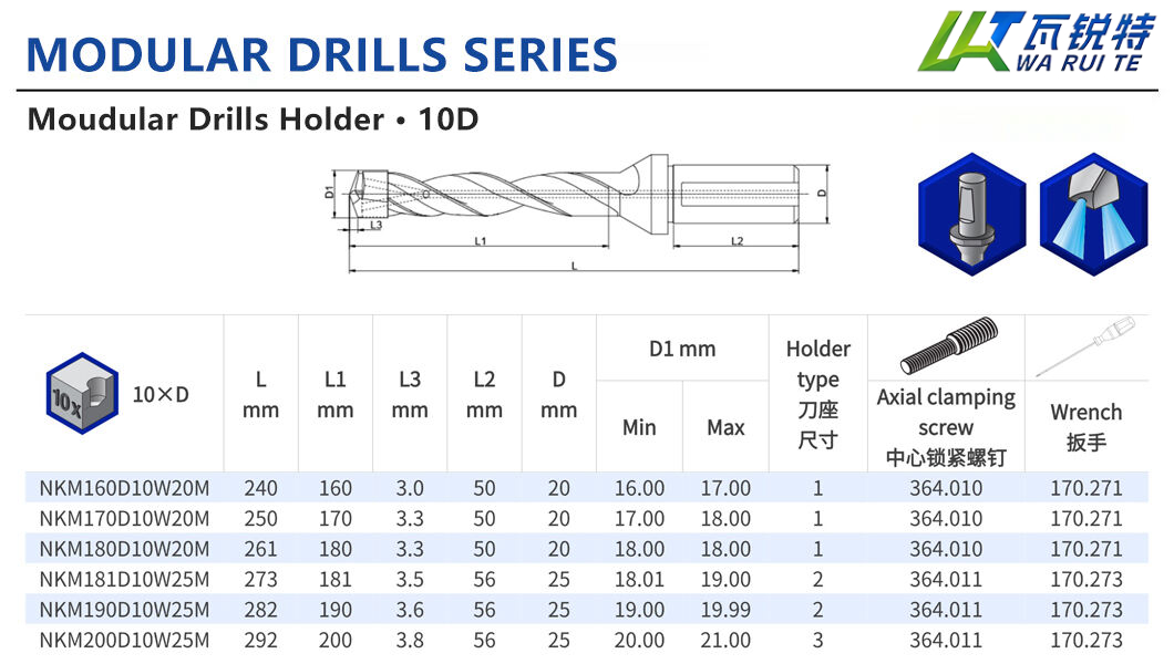 Standard configurations support drilling depths of 10 times the hole diameter (D), covering a hole diameter range of 12.5–40 mm (0.4921–1.5748 inches); multiple tool levels are also available to precisely adapt to the drilling needs of various materials.