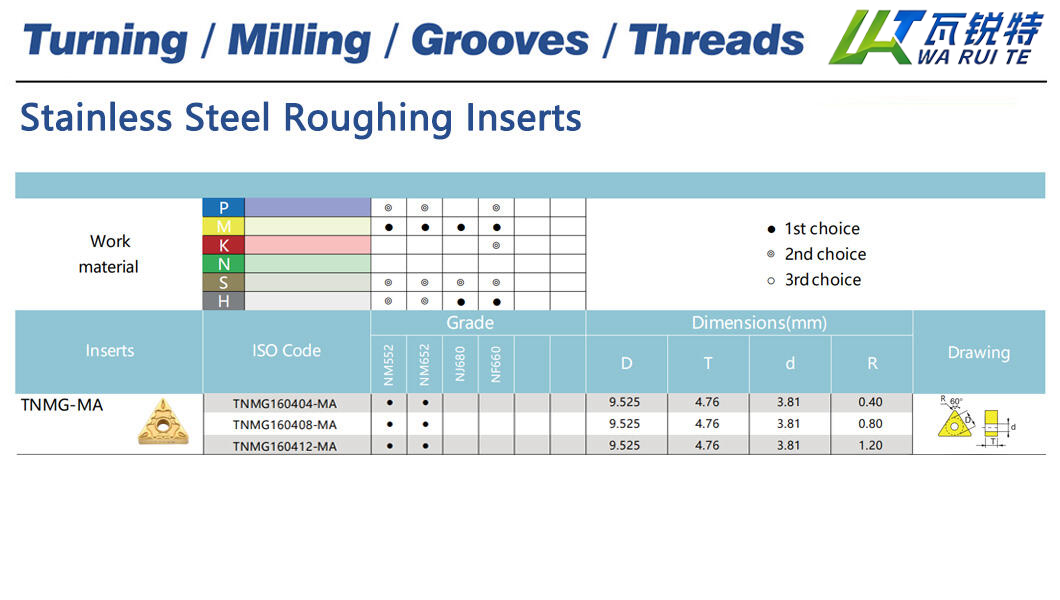 | TNMG160412-MA | NM552 / NM652 | D: 9.525 / T: 4.76 / d: 3.81 / R: 1.20 |