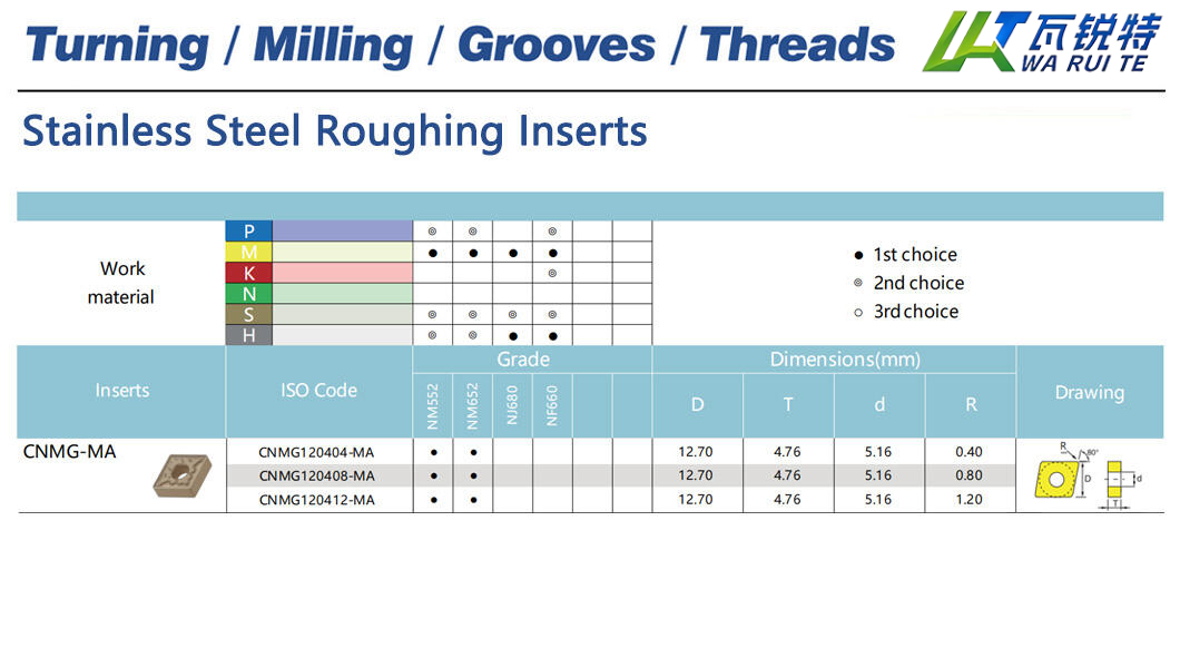 | CNMG120408-MA | NM552 / NM652 | D: 12.70 / T: 4.76 / d: 5.16 / R: 0.80 |