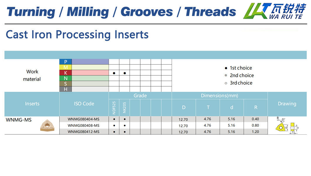 | WNMG080408-MS | NM552 / NM652 | D: 12.70 / T: 4.76 / d: 5.16 / R: 0.80 |