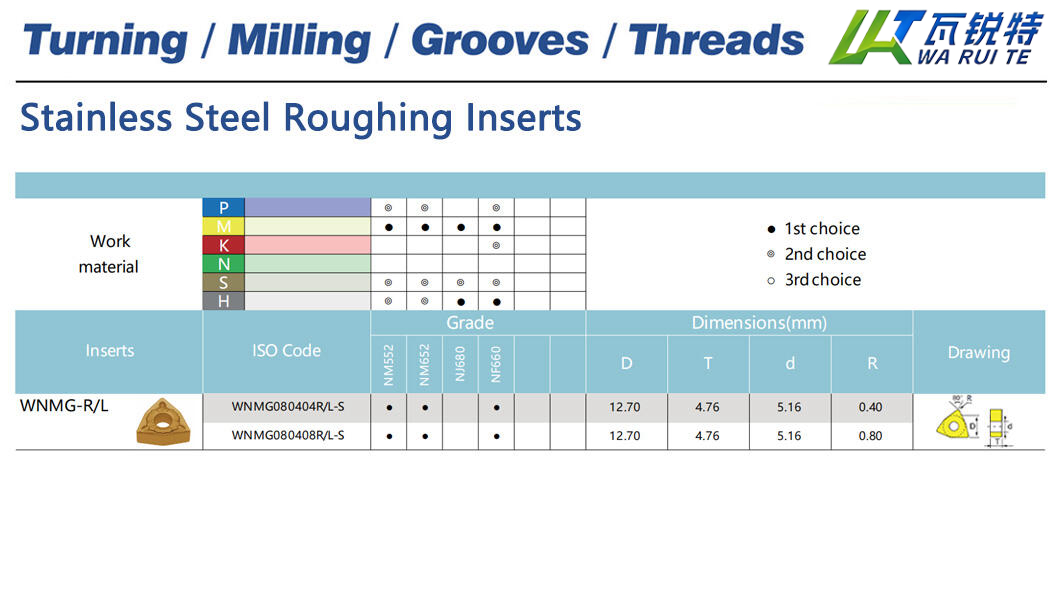 | WNMG080404R/L-S | NM552 / NM652 / NF660 | D: 12.70 / T: 4.76 / d: 5.16 / R: 0.40 |