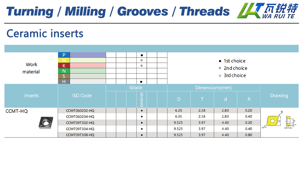 | CCMT09T304-HQ | N215 | D: 9.525 / T: 3.97 / d: 4.40 / R: 0.40 |