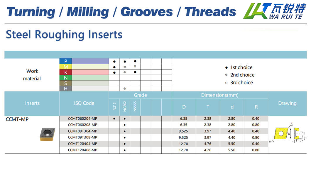 | CCMT120408-MP | NG202 | D: 12.70 / T: 4.76 / d: 5.50 / R: 0.80 |