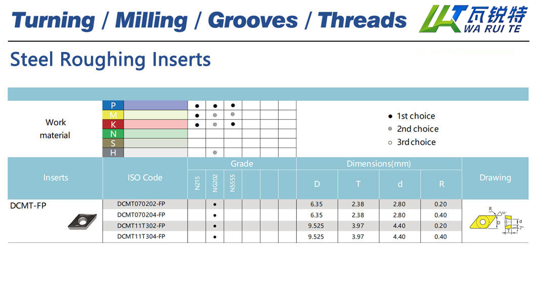 | DCMT11T304-FP | NG202 | D: 9.525 / T: 3.97 / d: 4.40 / R: 0.40 |