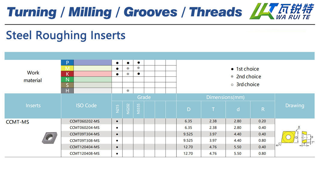 | CCMT09T308-MS | N215 | D: 9.525 / T: 3.97 / d: 4.40 / R: 0.80 |