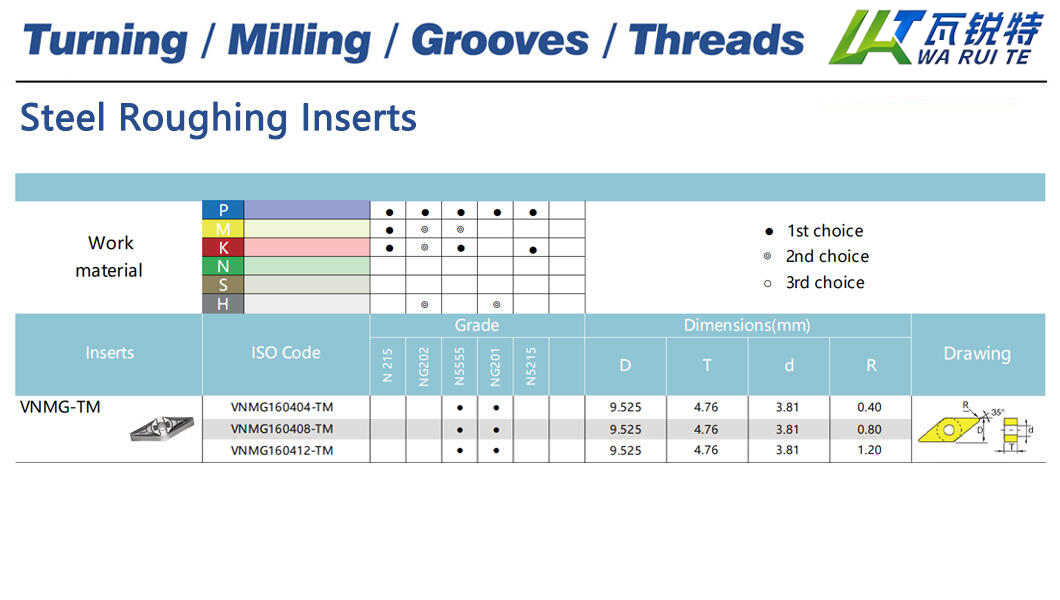 | VNMG160412-TM | N5555 / NG201 | D: 9.525 / T: 4.76 / d: 3.81 / R: 1.20 |