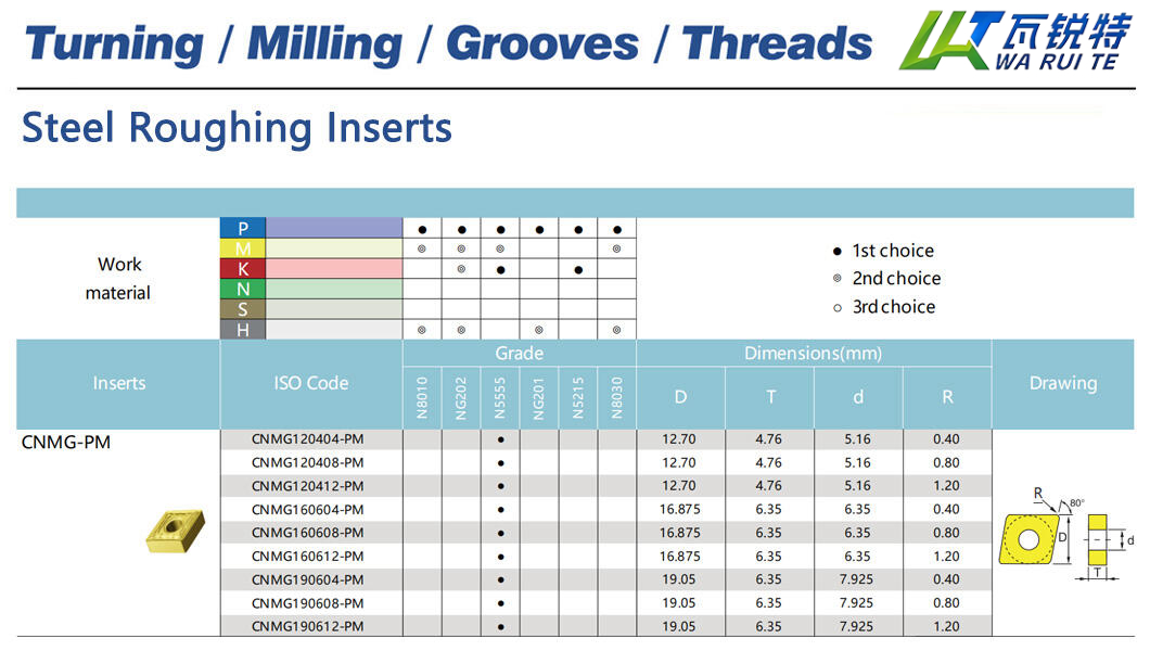 | CNMG120408-PM | N5555 | D: 12.70 / T: 4.76 / d: 5.16 / R: 0.80 |