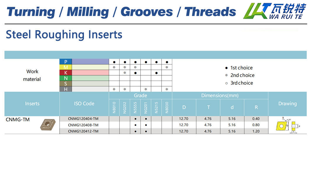| CNMG120404-TM | N5555 / NG201 | D: 12.70 / T: 4.76 / d: 5.16 / R: 0.40 |