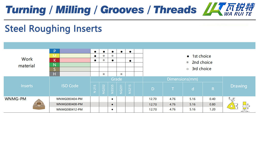 | WNMG080412-PM | N5555 | D: 12.70 / T: 4.76 / d: 5.16 / R: 1.20 |