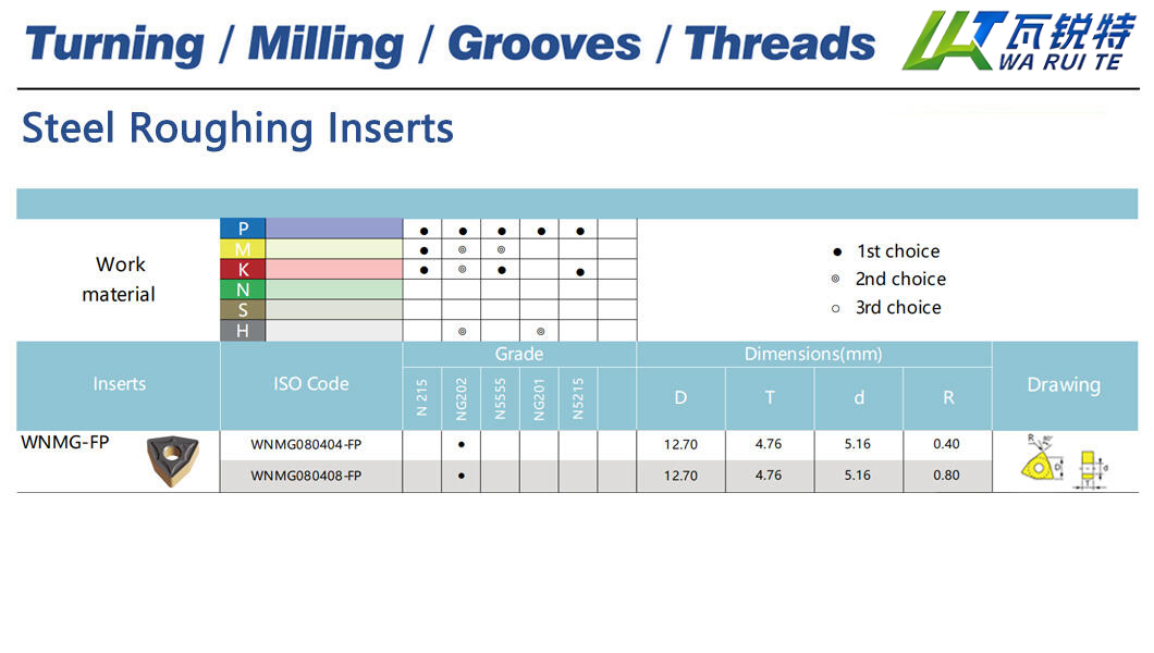 | WNMG080408-FP | NG202 | D: 12.70 / T: 4.76 / d: 5.16 / R: 0.80 |