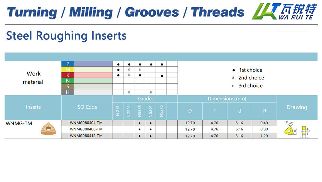 | WNMG080412-TM | N5555 / NG201 | D: 12.70 / T: 4.76 / d: 5.16 / R: 1.20 |