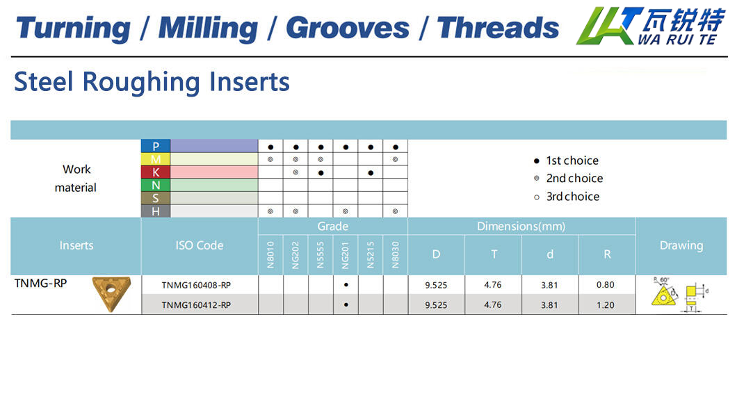 | TNMG160412-RP | NG201 | D: 9.525 / T: 4.76 / d: 3.81 / R: 0.80 |