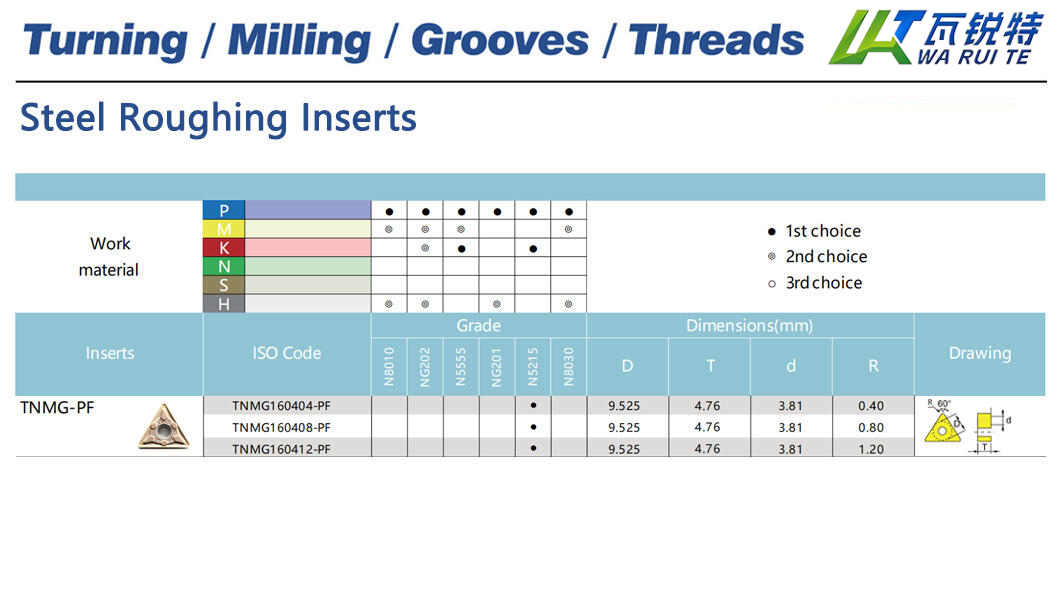 | TNMG160408-PF | N5215 | D: 9.525 / T: 4.76 / d: 3.81 / R: 0.80 |