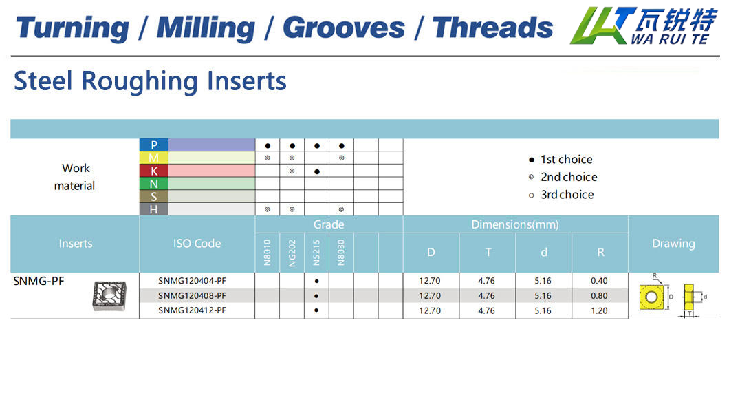 | SNMG120412-PF | N5215 | D: 12.70 / T: 4.76 / d: 5.16 / R: 1.20 |