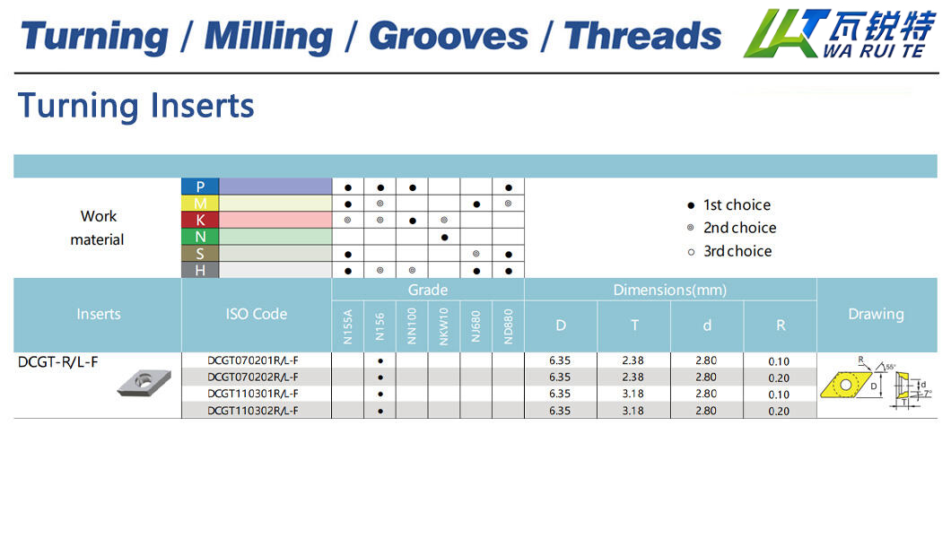 | DCGT110302R/L-F | N156 | D: 6.35 / T: 3.18 / d: 2.80 / R: 0.20 |