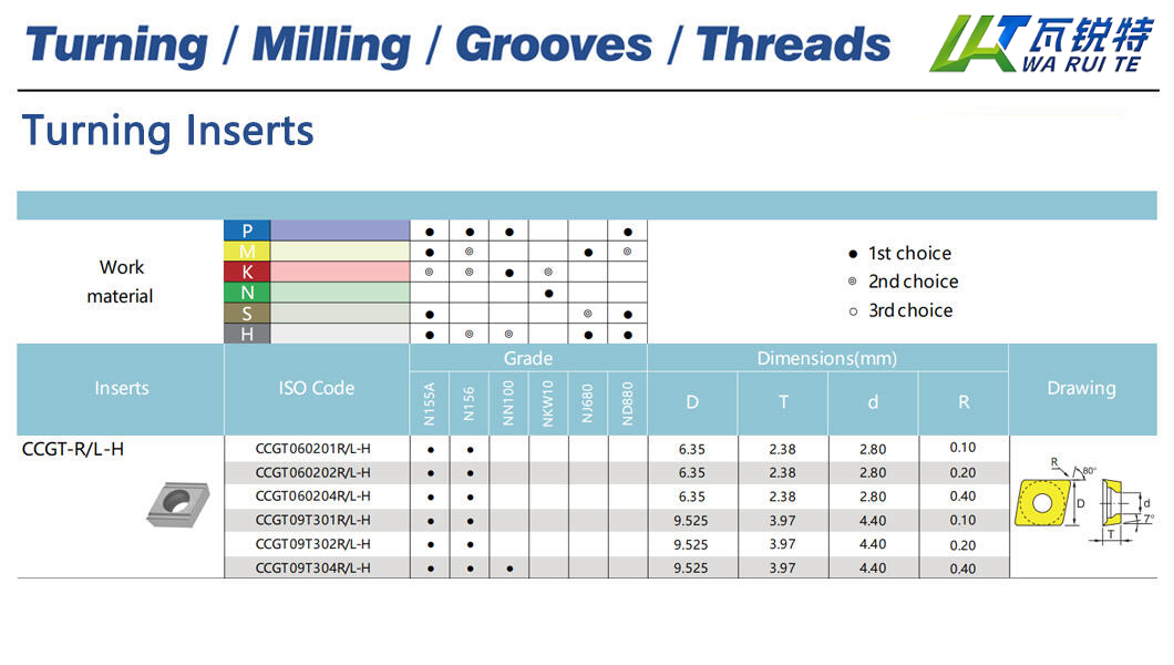 | CCGT060202R/L-H | N155A / N156 | D: 6.35 / T: 2.38 / d: 2.80 / R: 0.20 |