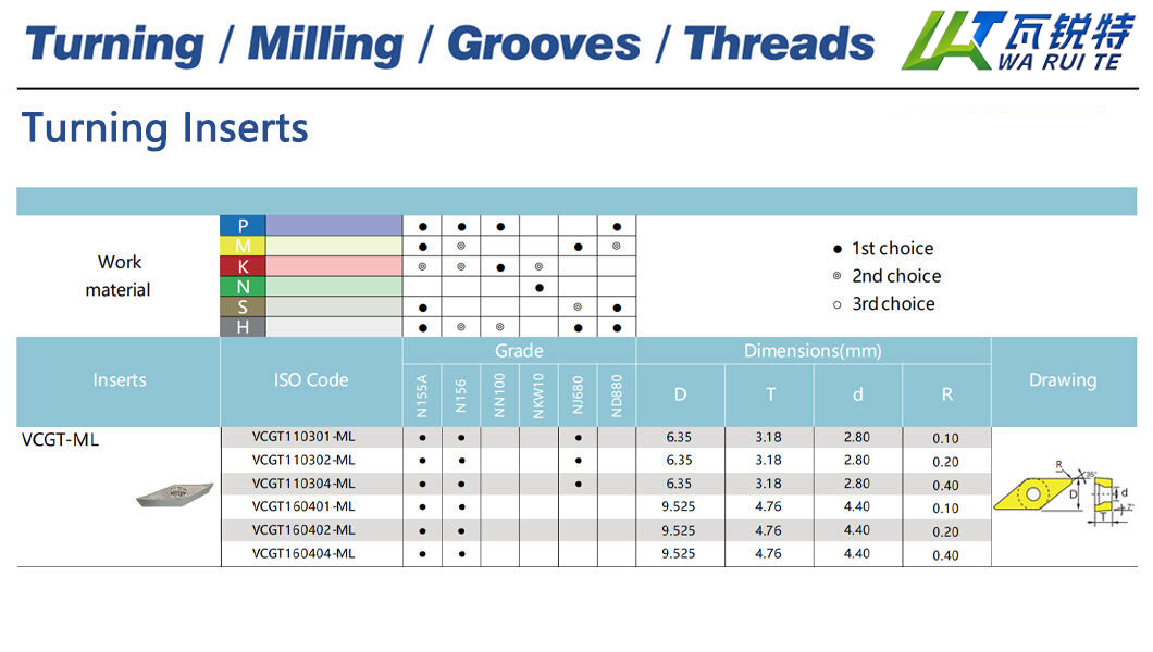 | VCGT110302-ML | N155A / N156 / NJ680 | D: 6.35 / T: 3.18 / d: 2.80 / R: 0.20 |