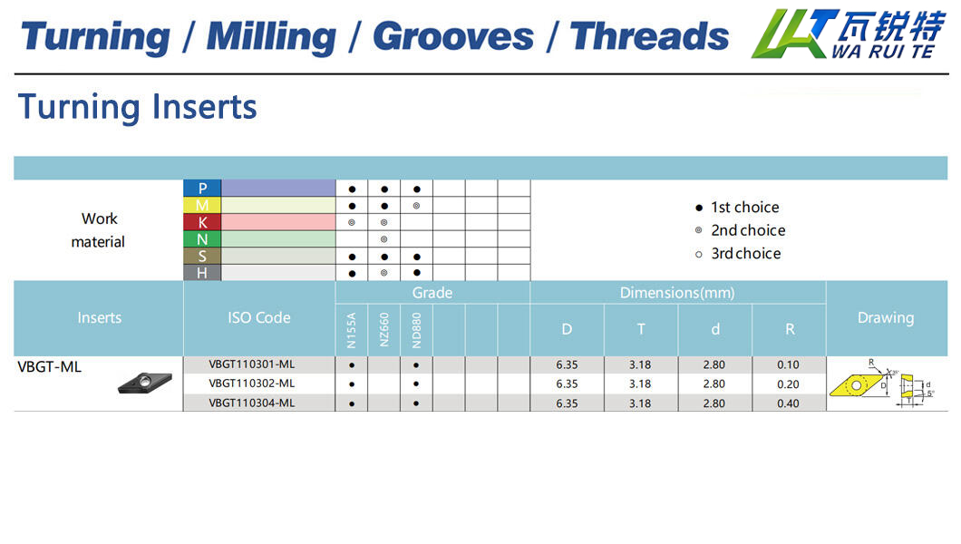 | VBGT110301-ML | N155A / ND880 | D: 6.35 / T: 3.18 / d: 2.80 / R: 0.10 |