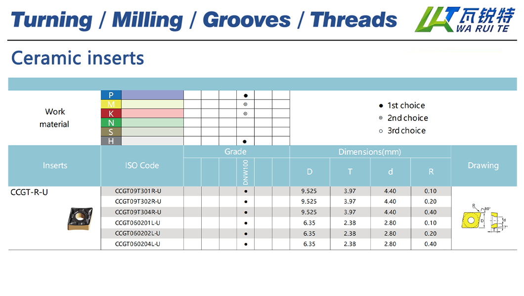 | CCGT09T301R-U | DNW100 | D: 9.525 / T: 3.97 / d: 4.40 / R: 0.10 |