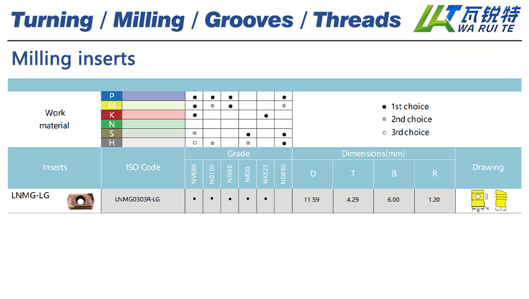 | LNMG0303R-LG | NV880 / NG100 / NJ660 / N820 / NK525 | D: 11.59 / T: 4.29 / B: 6.00 / R: 1.20 |