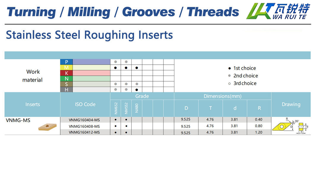 | VNMG160408-MS | NM652 / NM552 | D: 9.525 / T: 4.76 / d: 3.81 / R: 0.80 |