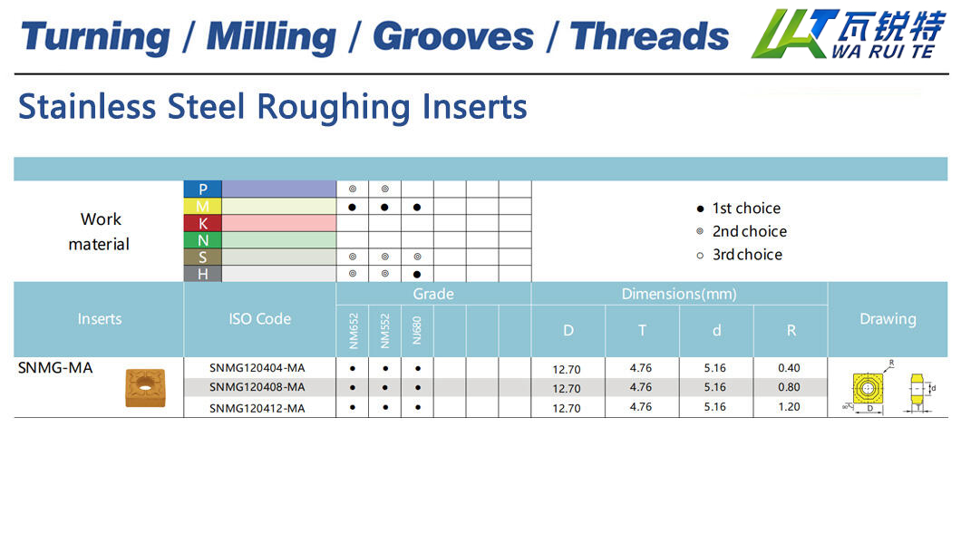 | SNMG120412-MA | NM652 / NM552 / NJ680 | D: 12.70 / T: 4.76 / d: 5.16 / R: 1.20 |
