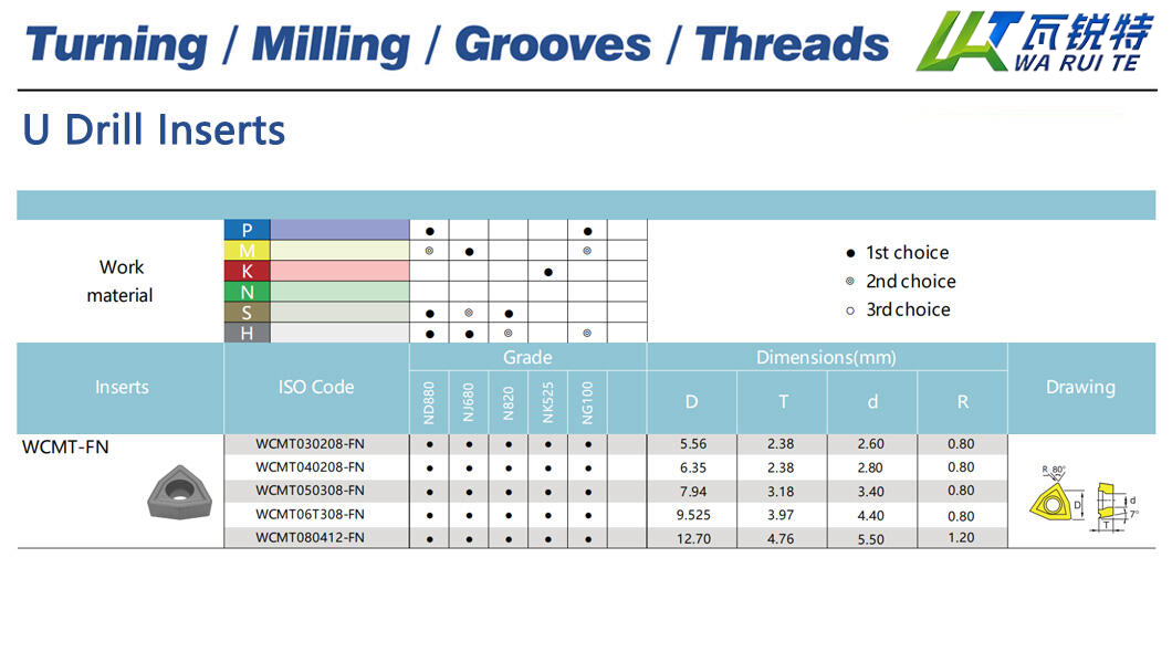 | WCMT06T308-FN | ND880 / NJ680 / N820 / NK525 / NG100 | D: 9.525 / T: 3.97 / d: 4.40 / R: 0.80 |